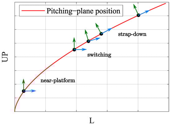 For a period of time after takeoff, the two axes of rotation are controlled so that the attitude of the measuring coordinate system m with respect to the pitching-plane remains unchanged: and ; this is the near-platform mode. Then the switch to strap-down mode starts at a certain time.