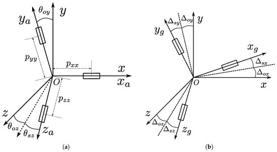 Among them, is the dimensionless scale matrix, and indicates the relative error of the scale coefficient. is the installation matrix. The installation error is defined in Figure 2a.