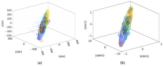 Monte Carlo simulation results under bigger initial errors. (a) Position error distribution. (b) Velocity error distribution.