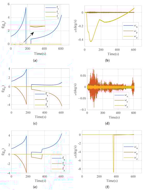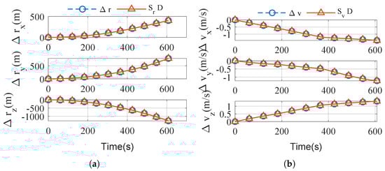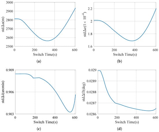 According to Figure 7, users can choose when to switch based on the task metrics they care about. For example, if you want to improve the accuracy of the orbit’s semi-major axis, then selecting ts = 367 s corresponding to the lowest point of the curve based on Figure 7a is the required switching time. In view of Equation (54), if other task indicators other than a, e, i, are required, then the corresponding can be constructed, and the required switching time can be selected according to the corresponding curve.