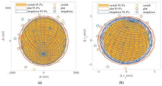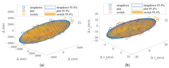 The results of the 500 repeated simulations are shown in Figure 8, where the shaded area represents the error ellipsoid (about 95.4% confidence). It can be seen that the position error and speed error through mode switching are better than the pure strap-down and near-platform mode; the speed error, especially, has been significantly improved.