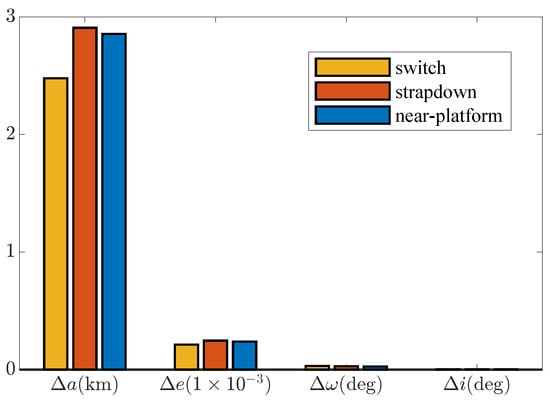 The switching mode’s speed and position accuracy are improved compared with the strap-down mode and near-platform mode, and the orbit injection accuracy is mainly reflected in the semi-major axis accuracy. Compared with the strap-down mode, the orbit semi-major axis accuracy of the switching strategy is improved by about (compared with the mean value), and compared with the near-platform mode, the orbit semi-major axis accuracy is improved by about (compared with the mean value), which is a good improvement for such a simple strategy. At the same time, the variance of the orbit semi-major error is also smaller than the pure near-platform or strap-down mode.