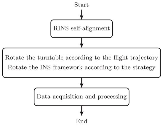 As shown in Figure 11, the experimental system consists of a 3-axis turntable, a RINS, a regulated power supply, and a laptop computer. Among them, the 3-axis turntable is used to simulate the attitude change during the rocket launch, the RINS is used to measure the attitude change, the regulated power supply is used to power the RINS, and the laptop is used for data acquisition and processing. The flight trajectory and inertial navigation strategy used in the experiment were consistent with Section 4.1.