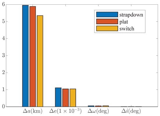 Figure 15 evaluates the effect of mode switching from the perspective of the orbit parameter error. It can be seen that the effect of mode switching is mainly reflected in the improvement of tje orbit semi-major axis accuracy. Among them, the switching strategy improves the accuracy of the orbit semi-major axis by about compared with the strap-down mode and improves by about compared with the near-platform mode.