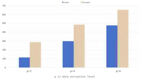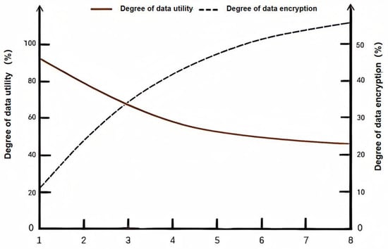 Figure 3 illustrates the relationship between the degree of data utility and the degree of data encryption, varying from value to value . These two lines show an apparent inverse relationship. We can conclude that the higher the level of data encryption, the lower the availability of data. When , it means that the user chooses to encrypt the data within the two arrays representing the greater relevance. The data start to be encrypted with only of total data. In the meantime, the data utility begins to fall, declining from to nearly of the total. When , the degree of data encryption (above ) rises over the degree of data utility (nearly ), meaning that the greater the percentage the data encrypted, the lower the utility of data, which can decrease the chance of raw data being acquired by unscrupulous people. When , the level of data encryption reaches the highest point—almost —and the degree of data utility drops to the lowest level— in total—resulting in an enhanced level of data protection with reduced risk of being hacked by others.