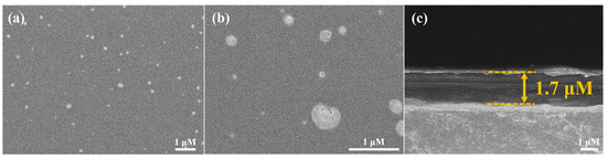 SEM images of the Pt/TE-MTS film: (a,b) surface morphology; (c) cross-sectional morphology.