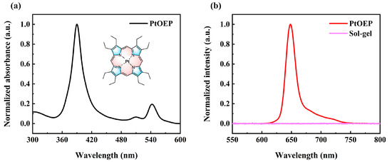 The optical properties of the film are crucial for its application, with PtOEP serving as the oxygen indicator and the sol–gel material acting as the supporting matrix. In this study, the typical UV–visible absorption spectrum and photoluminescent spectrum were measured to investigate the optical characteristics of the probe and the supporting matrix, as shown in Figure 3. The normalized UV–visible absorption spectrum of PtOEP is shown in Figure 3a, with the chemical structure of PtOEP provided in the inset of Figure 1a. Two weak absorptions at 510 nm and 543 nm, corresponding to the Q–bands [33], and a strong absorption at 389 nm, which belongs to the Soret band [34], were observed in the spectrum. Consequently, a 405 nm laser was selected as the excitation source to obtain the photoluminescence spectrum. The normalized photoluminescence spectra of PtOEP (red line) and TEOS–MTES supporting matrix (pink line) are shown in Figure 3b. A strong photoluminescence peak centered at 648 nm was observed in the photoluminescent spectrum of PtOEP, confirming it as a phosphorescence peak. Additionally, the TEOS–MTES supporting matrix exhibits no luminescence under the excitation of a 405 nm laser, as illustrated in Figure 3b.