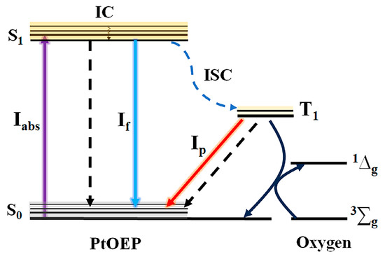 To investigate the correlation between GC and the phosphorescence of PtOEP, the potential energy transfer processes were analyzed, as illustrated by the energy level scheme in Figure 4. When a PtOEP molecule is excited by a 405 nm laser, it transfers from the ground state (S0) to a higher singlet excited state, subsequently relaxing to the bottom of the first singlet excited state (S1). At the T1 state, PtOEP has three possible decay pathways: (i) returning to S0 via a non–radiative pathway; (ii) fluorescence emission (If); and (iii) it may transfer to the first excited triplet state (T1) by means of the intersystem crossing process [35]. PtOEP at T1 state can return to S0 through a phosphorescence (Ip) and a non-phosphorescence way; additionally, it can also return to S0 via interacting with O2. Therefore, the phosphorescence intensity of PtOEP can be effectively quenched by oxygen molecules in the environment.