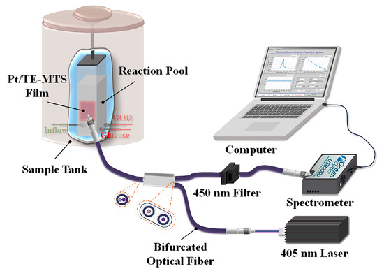 To further obtain the correlation between phosphorescence and glucose based on the Pt/TE-MTS film, a series of devices were planned, as shown in Figure 5.