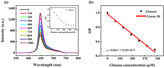 (a) Luminescence spectra of the sensing film at different glucose concentrations. Insert: the relationship between OP and glucose concentrations. (b) OP at different glucose concentrations in a range of 0–720 μM.