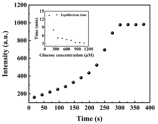 It takes time for the redox reaction which involves glucose, oxygen, and GOD to carry on. To accurately measure the phosphorescence intensity at various GCs, it is necessary to determine the time required for the redox reaction to reach completion. The phosphorescence of the Pt/TE-MTS film was monitored with a fixed amount of glucose (360 μM) stored in a sealed container, as shown in Figure 7. It was observed that the phosphorescence intensity increased significantly within the first 300 s, after which the phosphorescence intensity tended to be stabilized. Based on this observation, the reaction was confirmed to be complete at 300 s. To obtain the equilibrium times for various GCs involved in Figure 6, the phosphorescence of the Pt/TE-MTS film was measured over the increasing reaction times for GCs ranging from 0 to 1080 μM, as shown in the inset of Figure 6. It was found that the equilibrium time decreased as the GC increased. This behavior could be attributed to the enhanced interaction between glucose and GOD, leading to faster oxygen consumption and quicker stabilization of phosphorescence. All phosphorescence measurements of the Pt/TE-MTS film in Figure 6 were obtained after the reaction had fully completed in the sealed container to ensure accurate glucose detection.