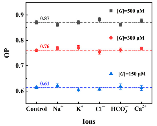 OP values in solutions with GC of 150, 300, and 500 μM containing various interfering ions, blank glucose solution at the same GC was defined as the control group.