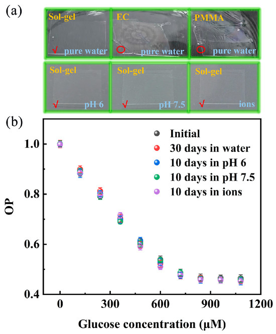 The robustness and stability of the Pt/TE-MTS film in complex environments are critical for its practical application. Therefore, the stability of the Pt/TE-MTS film was evaluated in various solutions. The film was immersed in different solutions for specified periods: one month in pure water, 10 days in solutions with pH values of 6 and 7.5, and 10 days in solutions containing ions. Furthermore, two commonly used matrices for glucose detection (EC and PMMA) were combined with PtOEP separately for comparison, as shown in Figure 11a. It can be observed that the Pt/TE-MTS film remains firmly adhered to the glass sheet after being immersed in pure water for one month, while both the Pt/EC film and Pt/PMMA film were significantly detached from the glass. Additionally, the Pt/TE-MTS film remained tightly adhered to the glass sheet after immersion in solutions containing ions as well as in pH values of 6 and 7.5 for 10 days. Furthermore, the sensitivity of the Pt/TE-MTS film for GC detection was also verified. The relationship between OP and GC for the immersed films was monitored and compared with that of the unsoaked sample, as shown in Figure 11b. It was found that in the GC range of 0–720 μM, all immersed films exhibited a linear relationship between OP and GC, which then remained constant, consistent with the unsoaked sample. These results indicate that Pt/TE-MTS film demonstrates high stability and robustness in complex environments for continuous glucose detection.