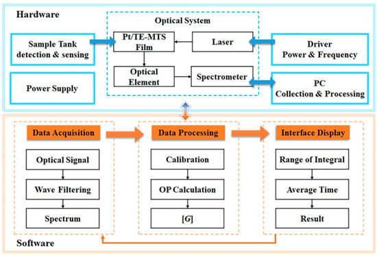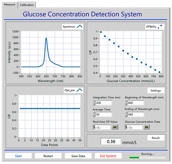To extend the scope of application for glucose detection using the Pt/TE-MTS film, a system based on LabVIEW was developed to realize the GC measurement. The display panel of the detection system is shown in Figure 12. The system primarily consists of three modules: a spectra testing module, a data recording and analysis module, and a parameter setting module. The emission spectrum is recorded within a wavelength range of 500–850 nm, and the OP value is calculated through multiple data acquisitions; the linear relationship between the OP value and the corresponding GC is displayed. Moreover, the integration time, average time, and the wavelength range of integration for the system could be easily adjusted by the users. The principle block diagram of the glucose detection system is shown in Figure 13. Furthermore, the system incorporates data storage and analysis features to enhance usability. Based on this system, GC can be automatically detected in real-time.