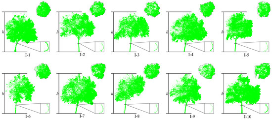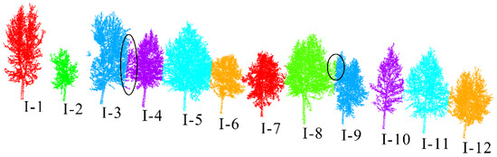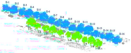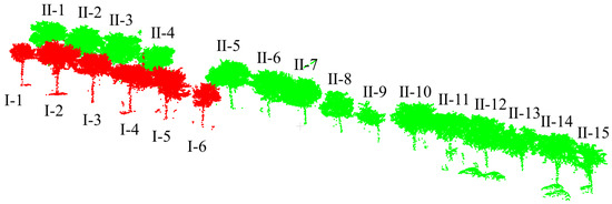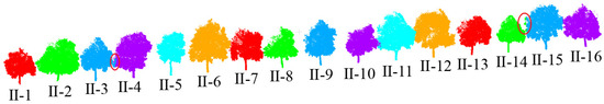 The test results indicate that the proposed algorithm can accurately extract all street trees in the test scenario with an average extraction accuracy of 99.07%. In addition, there are a few instances of the tree branch and leaf point cloud segmentation in the qualitative results, but the segmentation of point cloud parts has a small impact on the overall segmentation accuracy of the tree. Specifically, in Figure 9, due to the occurrence of edge branches and leaves being divided into I-4 in I-3, the R-value of I-3 is relatively low. At the same time, there is also a situation where the fine division of tree boundaries is not high (I-8 and I-9 in Figure 9; II-4 and II-5 in Figure 10), resulting in some branch and leaf point clouds of I-9 and II-4 being divided into I-8 and II-5, respectively. However, due to the difference in the number of point clouds between I-8, I-9, and II-4, II-5, the misclassification of point clouds has a significant impact on the accuracy of II-5 small trees, and the impact on I-8 and II-4 is not significant in quantitative evaluation.