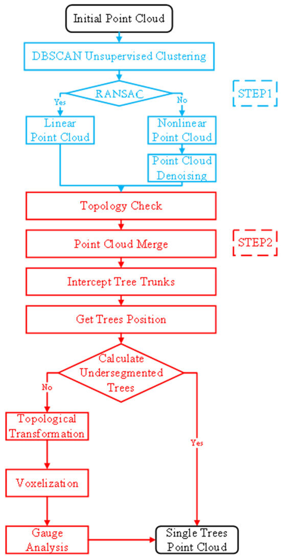 Due to severe obstruction between tree branches, some tree trunks are missing, resulting in over-segmentation of the trees, as shown in Figure 5. To avoid the situation where some over-segmentation results are filtered out during the point cloud denoising process, resulting in lower accuracy of the final individual tree segmentation, this article uses the random sample consensus (RANSAC) algorithm to detect the linear state of clustering results. Among them, the distance threshold from the set point to the straight line is 0.4 m. Finally, the average number of points in DBSCAN nonlinear clustering results is statistically analyzed. Then, the clustering results below one third of the average number of points are identified as noise for filtering.