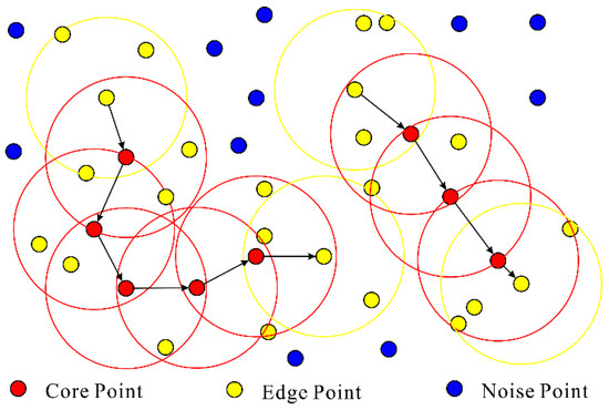 DBSCAN is a density-based spatial clustering algorithm for measurement data. Due to its ability to effectively solve the interference of noisy data, there is no need to set the number of targets in advance, and it enables the discovery of clustering targets with arbitrary convex shapes in dense point cloud data. This algorithm is widely applicable in the clustering process of point cloud data. DBSCAN uses a set of parameters about ‘neighborhood’ to describe the compactness of sample distribution, which defines all point cloud data as core points, boundary points, and noise points, with different types of points corresponding to different point cloud data densities. Interference point cloud data and effective point cloud data can be distinguished by dividing different types of point cloud data through density. The principle of the DBSCAN algorithm is shown in Figure 4.