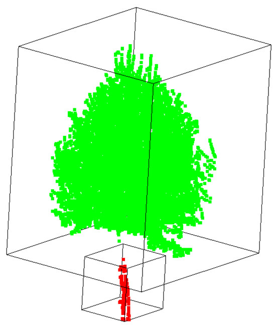 Tree height refers to the length of a tree from its root and stems to the top of its main stem, which is measured in meters and generally accurate to 0.1 m. Tree height is a factor that represents the height of a tree and is also a major measurement factor for fallen and standing trees. In traditional methods, tree height is mainly measured using a height gauge. In this paper, point cloud data are used for extraction. The measurement of the height of a living tree is relatively difficult. When the height of the tree is greater than two meters, it is necessary to use a height gauge for measurement. Due to the difficulty in seeing both the top of the tree and the base of the tree trunk at the same time, measurement errors are invisibly increased. The calculation of tree height based on point cloud data can not only reduce errors but also be convenient. The specific algorithm is as follows: the height difference between the highest point of the tree point cloud and the root node is the tree height [47,48].