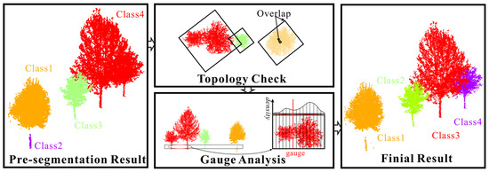 The pre-segmentation results are inaccurate enough with some over-segmentation or under-segmentation. In this part, we will optimize the initial results to improve the segmentation accuracy. Due to the severe occlusion between tree branches, there are some over-segmented point cloud data in the initial tree segmentation results. To avoid the impact of over-segmentation on the final segmentation accuracy, this article conducts XOY surface projection on the initial segmentation results and topology overlay analysis on the projection results to identify the possible over-segmentation of trees in the initial extraction results. When two or more cluster projection results completely overlap, we merge the completely overlapping point cloud data to optimize the problem of tree point cloud over-segmentation caused by uneven point cloud density caused by branch covering.