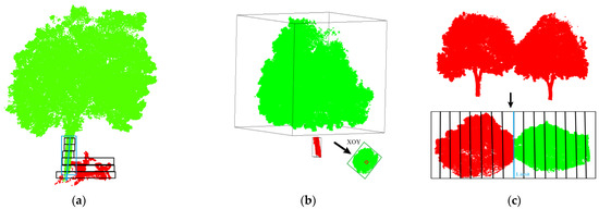 Specifically, topology checking and gauge analysis are used to solve the problem of over-segmentation and under-segmentation of single trees. The topology checking mainly includes the topology examination of the growth direction of the trunk of a single tree and the topology relationship analysis of the XOY canopy, as shown in Figure 7. The trunk growth direction of a single tree is based on several voxels divided along the Z-axis direction to obtain the trunk growth topology framework, and the topology skeleton is used to achieve precise segmentation of the trunk to remove the interference of ground objects around the trunk, as shown in Figure 7a. Due to the lack of point clouds that may occur during the scanning process of point cloud data, the phenomenon of single wood over-segmentation may occur in the initial segmentation process. The topology relationship of the XOY canopy was combined by analyzing the topology relationship of the XOY projection surface of the initial segmentation results, as shown in Figure 7b. The limit analysis is mainly used to deal with the point cloud of under-segmented trees, which is divided into several voxels along the trunk connection direction based on the XOY plane, and the boundary position between trees is obtained by analyzing the density change in point clouds between voxels so as to achieve an accurate segmentation of under-segmented trees, as shown in Figure 7c.