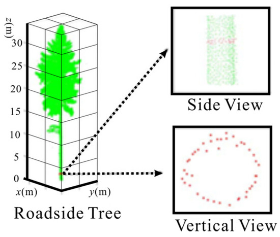 The three-dimensional (3D) mobile laser scanning (MLS) technology is a new non-contact, high-precision, and high-density technology that is able to obtain approximate surface real models quickly and actively [9,10,11]. Using profiling scanning techniques and detection lase pulse intensity reflected from the target surface, MLS systems are applied to urban road networks and objects on both roadsides using multiple sensors onboard moving vehicles. There are an increasing number of applications based on MLS point clouds to construct fine models along the road. For example, MLS data are used to extract buildings, road surfaces, trees, traffic signs, poles, and cars [12,13,14]. With the development of cities, many trees are planted along the urban streets. The real-time measurement and management of trees are required. MLS point clouds provide intensive sampling density and sufficient information to recognize the information of trees.