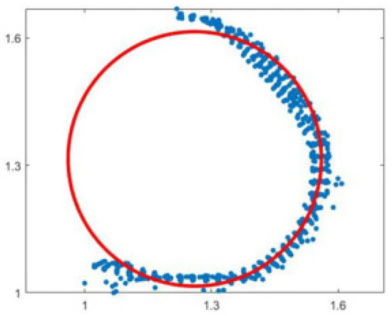 At this point, only parameters A, B, and C are required to be made for when the value of θ is the smallest, and the effect of fitting a circle is the best. Immediately, is used to calculate the partial derivatives of A, B, and C, respectively, and make the partial derivatives equal to zero to obtain the extreme points to minimize the sum of the difference between the two squares. The fitting circle effect is better when the input point cloud data match the chest diameter position well, as shown in Figure 9.