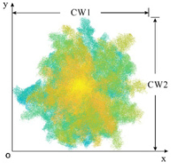 The crown, as the main component of a tree, is an essential indicator for measuring its growth. The parameter values are usually represented by the crown width, which generally refers to the average width of the tree crown in the east–west and north–south directions, as shown in Figure 10. However, considering that the obtained tree crown point cloud may be incomplete or irregular, this paper projects the individual tree point cloud data onto a two-dimensional (2D) plane. Then, it calculates the 2D convex polygon of the individual tree from the discrete point data of the 2D plane. The convex points on the 2D convex polygon are connected, and the spacing between the convex points is calculated in turn. Finally, the individual tree crown can be obtained by screening the maximum spacing between the convex points. In this paper, the minimum convex polygon is obtained by constructing the plane discrete point cloud data set using the fast package method.
