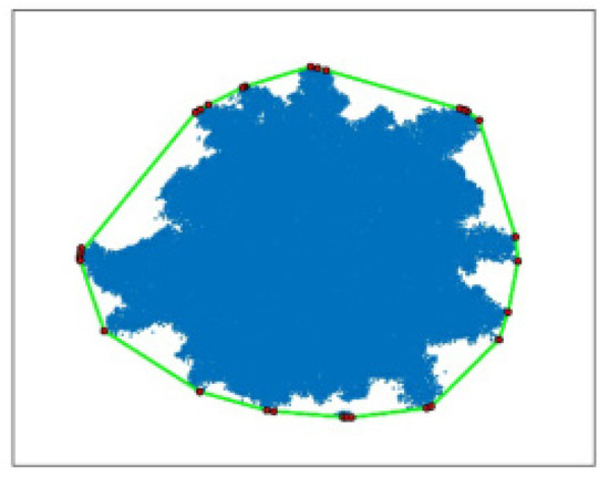 As shown in Figure 11, the crown diameter of the final individual tree based on the crown convex hull method is used. For the body, first search for and obtain the two diagonal points of the convex hull based on the principle of prioritizing the X coordinate. Then, the two diagonal points are connected, and the point cloud set is divided into two sub-point clouds. The point farthest from the diagonal convex hull line from the sub-set is selected as the new convex hull point. Iterating the above process until no new convex hull points appear, obtain the set of convex hull vertices in the 2D plane. Finally, the paired convex hull points with the maximum spacing value are selected and calculated to obtain the crown area of an individual tree. The calculation formula can be expressed as