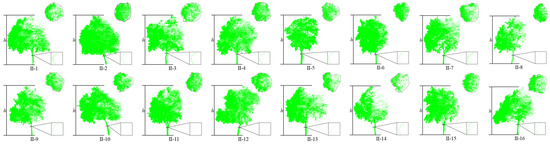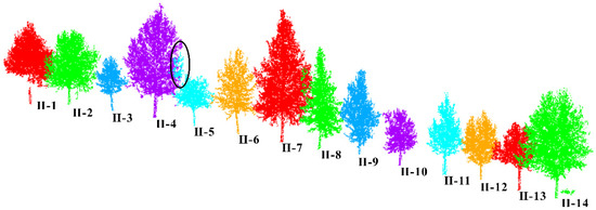 This article uses the proposed individual tree segmentation algorithm to process the dataset and verify its effectiveness. The quantitative evaluation results are shown in Table 1, and the segmentation effects of individual trees on both sides of the road are shown in Figure 12 and Figure 13, respectively.