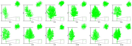 The Dublin dataset contains data from ALS acquired via helicopter aerial photography in 2015, focusing on a densely populated area of approximately 2 square kilometers in the center of Dublin. The dataset includes an initial LiDAR point cloud of over 1.4 billion points, which is split into smaller pieces for easier management and processing. The average density of the point cloud is between 250 and 348 points/m2. In addition, more than 260 million laser scan points in the dataset are manually annotated into about 100,000 objects, which are classified into 13 categories: buildings, trees, facades, windows, and streets. The vegetation class includes all types of separable plants, including grass, bushes, and trees. As shown in Figure 23, part of the Dublin sample data contains 21 street trees and 197,210 point clouds.