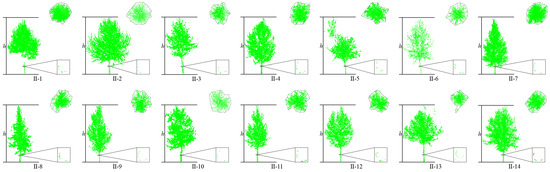 The application of ground 3D MLS technology in tree parameter extraction and visualization research is an innovation and expansion of ecology and forestry research. By utilizing ground 3D laser-scanning technology and designing relevant algorithms, basic parameters such as tree diameter and crown volume can be accurately, quickly, and efficiently extracted without damaging trees and saving human resources. In order to better obtain forest information, many scholars have researched tree segmentation and parameter extraction based on remote sensing images and point cloud data. Li et al. [26] proposed a top–down point cloud segmentation (PCS) algorithm to segment (or delineate) a single tree. Wang et al. [27] proposed a single-tree segmentation algorithm using the Euclidean distance between treetops as the segmentation condition is proposed. Recently, deep learning methods have been used for tree segmentation. Zhang et al. [28] designed a deeply supervised tree classification network (DSTCN) using a height-intensity dual attention mechanism to deliver improved classification performance. Further, tree structure parameter extraction is also proposed. Suárez et al. [29] described an approach based on aerial photography and airborne LiDAR to estimate individual tree heights in forest stands using a tree canopy model.Chen et al. [30] proposed the tree top position identification method based on the local maximum algorithm of the point cloud and used the watershed algorithm and template-matching algorithm to locate the trees and extract the tree height and crown width. Fan et al. [31] proposed a quantitative structural model based on the modified AdTree method, and the model was reconstructed to extract the tree volume, diameter at breast height (DBH), and tree height. However, these approaches have limitations in automatically distinguishing individual crown sizes, and further work is needed to estimate diameter distribution and volume [32].