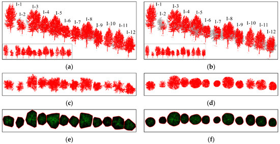 Comparison of individual tree segmentation effects on the left side of the road. (a) The segmentation effect of the individual tree algorithm of our method; (b) Comparison algorithm results of the individual tree segmentation; (c) Top view segmentation results of our method; (d) Top view results of comparison algorithm; (e) The convex hull of the tree crown results of our method; (f) The crown convex hull results of Comparison algorithm.