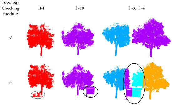 Since there may be disturbing features such as vehicles or signs around the trees, it is necessary to design relevant modules to analyze the initial extraction results and eliminate the interferences. This section verifies the effectiveness of the topology checking module by comparing the processing effect of the module with or without topology.