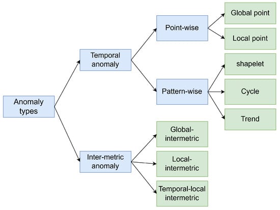 MTS consists of a set of univariate time series(metric), each of which describes different parts or attributes of a complex entity. Therefore, it not only has temporal dependencies within the metrics, manifested as periodic, trend, and other inherent patterns of each metric, but also inter-metrics dependencies within the entity, representing the linear or nonlinear relationships between all metrics of the entity at each time point [2,21]. Thus, anomalies in MTS can be divided into intra-metric anomalies (temporal anomalies) and inter-metric anomalies. The overall classification framework for anomaly types is shown in Figure 1. Temporal anomalies occur in multivariate, affecting multiple or all dimensions. Temporal anomalies primarily focus on individual data points and subsequences. Point-wise anomalies refer to unexpected events at a single time point, where the anomalous behavior of a time point can be a spike or glitch. Pattern-wise anomalies are anomalous subsequences, usually discordant or disharmonious. Here are the definitions of types of anomalies: