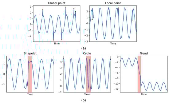 (a) Point-wise anomalies, the red dots indicate anomalies, and (b) Patten-wise anomalies, the red areas represent anomalies.