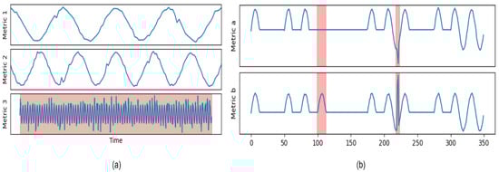 Temporal-local intermetric anomaly: The anomalies violate the dependencies between metrics and temporal relationships, focusing on how a specific metric breaks its correlation and deviates from its historical trend within a certain time period, as indicated by the highlighted red area on the right side of Figure 3b.