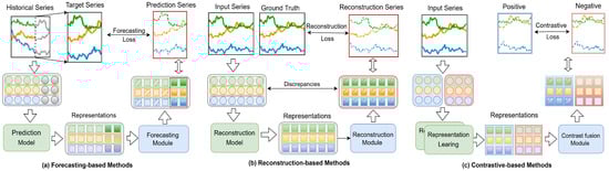 The examples of each type of anomaly criteria: (a) a forecasting loss; (b) a reconstruction loss; and (c) a contrastive loss.