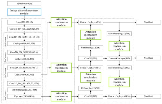 The network initiates the processing by resizing the input image to a uniform dimension of 640 × 640 pixels. Subsequently, the image enhancement module is used to augment the data. The CSPDarknet main feature extraction network is then employed to extract features, resulting in three effective feature layers. These layers are subsequently input into the PAFPN enhanced feature extraction network after passing through the attention mechanism module. Feature extraction and fusion are improved through upsampling and downsampling, producing three effective feature layers. Finally, these layers are input into the YOLO head, where regression and prediction are performed to accomplish the target detection task.