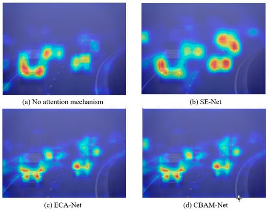 The attention mechanism module continuously adjusts the network’s weights in spatial or channel dimensions during the training process to emphasize the impact of important features on the model. This capability enables the network to adaptively enhance the extraction of target features within foggy images, subsequently improving target detection performance under foggy conditions. The experimental results demonstrated the significant role of the attention mechanism module in the network. However, describing the target detection process in deep learning is often challenging. To validate the role of the attention mechanism modules in the target detection network, a heat map visualization of the detected images was created using Grad-CAM. Figure 7 shows the heat maps generated by introducing the three different attention mechanism modules into the network for the images to be detected.