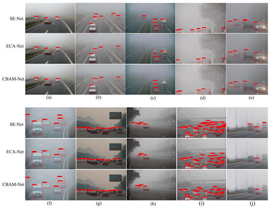 Figure 8 demonstrates that the network with the SE-Net attention mechanism module detected the highest number of targets, experienced the fewest missed detections, and exhibited the greatest confidence levels for each identified target. This indicates that the SE-Net attention mechanism module plays the most significant role in improving target detection performance in foggy environments among the three attention mechanisms. The overall detection results can be roughly divided into three scenarios: ① Minimal Difference in Detected Targets: Figure 8a,g demonstrate only slight variances in the number of detected targets; however, notable differences in confidence levels for each target were evident. These figures depict targets that were closely situated and less impacted by the foggy conditions, resulting in minor differences in detection outcomes among the different models. ② Fewer Detected Vehicle Targets: In Figure 8j, fewer vehicle targets were detected, with few targets successfully detected. The models introducing ECA-Nets and CBAM-Nets only successfully detected one vehicle, while the model introducing SE-Nets detected three vehicles and missed one. The figure indicates that the vehicles on the left and right have unusual shapes and complex color patterns compared to the other vehicles in the image. ③ Pronounced Differences in Detection Results: The remaining images showed more pronounced differences in target detection, with the best results from the network incorporating the SE-Net attention mechanism module and poorer results from the networks with ECA-Nets and CBAM-Nets. These discrepancies were particularly evident in distant targets, where the foggy conditions considerably impaired the environmental visibility, thereby complicating the detection process.