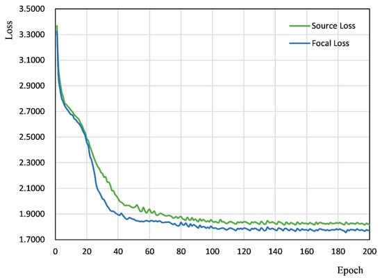 Figure 9 shows a comparison of the loss function curves before and after optimizing with Focal Loss. As depicted in Figure 9, the loss function curves exhibited significant differences post-optimization. Notably, during the early stages of network training, the differences between the two loss functions were relatively small, indicating that Focal Loss has a limited impact during the initial learning phase. However, after 20 epochs, the loss value decreased more rapidly when using Focal Loss, ultimately leading to convergence with a smaller loss value. This effect is clearly evident in the loss function graph. Focal Loss promoted faster convergence and enhanced loss values, which could have significant implications for a broad range of applications in deep learning.