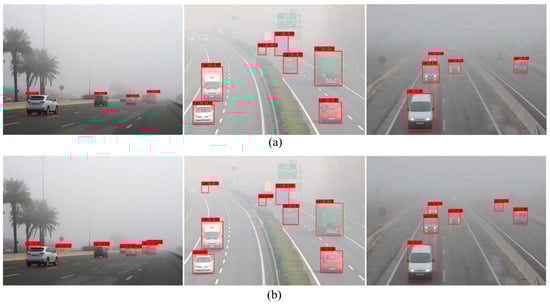 To validate the effectiveness of the image data augmentation, the optimized method was tested on the test set both before and after augmentation, with the results shown in Table 2. By comparing and analyzing these test results, it was verified that the optimized image data augmentation method significantly improves the network’s performance in target detection under foggy conditions.