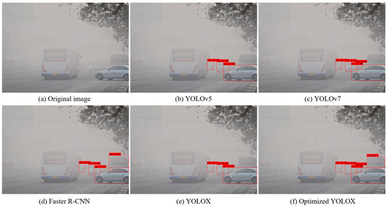 This study provides experimental results using the different detection methods on the test set to more accurately validate the effectiveness of the proposed network optimization scheme. The experimental results are summarized in Table 6. It can be concluded from the comparison of the experimental results that, when the original foggy image was detected directly without using the image processing module, the mAP of the optimized YOLOX network was significantly higher than that of the other target detection networks, and both its Recall and Precision values were higher. When the style transfer image-processing module was used, the optimized YOLOX network still achieved the highest mAP, with its detection performance markedly superior to that of the other networks. The experimental results demonstrate that the proposed network optimization scheme can effectively improve the detection performance of the target detection network, and the vehicle target detection performance of the optimized network outperformed that of YOLOv5, YOLOv7, Faster R-CNN, and the original YOLOX.