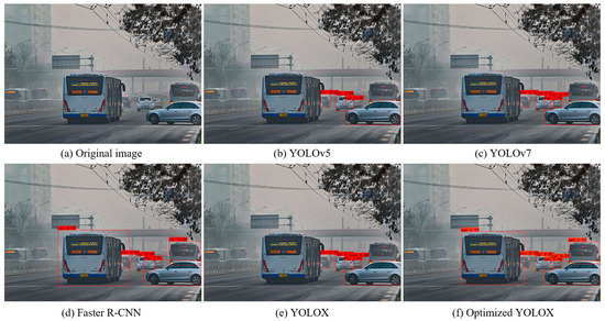 Visual comparison of performances of different object detection methods on foggy images. (a) is original image, (b) is YOLOv5, (c) is YOLOv7, (d) is Faster R-CNN, (e) is YOLOX, (f) is optimized YOLOX.