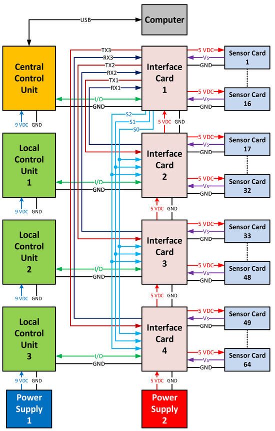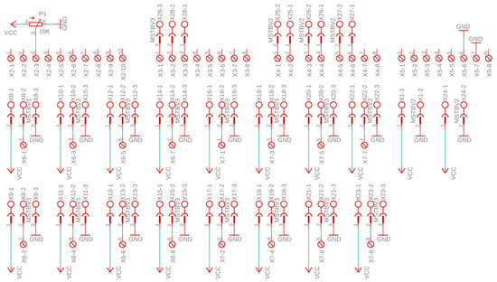 Interface cards facilitated the transmission of communication signals between the controller cards. Each controller had four built-in UARTs. In the measurement system, serial communication pins TX0 and RX0 of UART 0 were used to communicate with the computer via the USB port. In the schematic shown in Figure 4, the communication pins of the 1st, 2nd, and 3rd UARTs were connected to the X4 connector as TX3, RX3, TX2, RX2, TX1, and RX1, respectively. Communication control between the central controller and local controllers was facilitated by three digital input–output terminals connected to the X3 connector, as depicted in Figure 2.