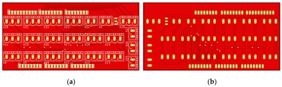 The connection between the sensor cards and controllers was provided by the interface cards. The measurement system obtained the two-dimensional temperature pattern of the heater using 64 sensors. There were four identical interface cards in the system, each connected to 16 sensor cards. A schematic of the interface card is provided in Figure 2, and a printed circuit diagram is shown in Figure 3. In the schematic, the X8–X23 connectors indicate the connection points of the sensor cards. The analog outputs of the 16 sensor cards were connected to the 16 analog inputs of the controller through X6 and X7 connectors.