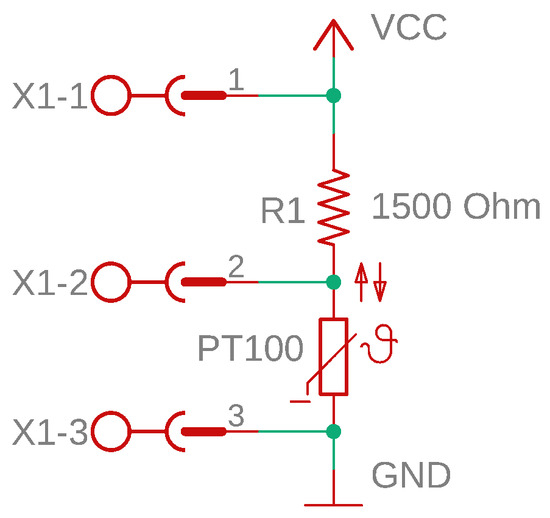 The temperature measurement circuit consists of a voltage divider resistor in series with a PT100 temperature sensor. In this circuit, VCC is the supply voltage, VS is the sensor voltage, R1 is the voltage divider resistor, and RS is the resistance of the PT100 temperature sensor [38,39,40,41,42]. In the design of the circuit, when determining resistance R1, factors such as the maximum sensor current, reference voltage (VR), and measurement accuracy should be considered. The maximum sensor current was 7 mA for the PT100 temperature sensor used in this study [43]. VR is the reference input voltage of the internal analog-to-digital converter (ADC). The smaller the VR, the higher the resolution of the measurement. However, if the VR is too small, the system will become more susceptible to noise in the environment. Ideally, the VR should be equal to the maximum sensor voltage. VR can be adjusted using an external voltage source or can be selected using the embedded software of the microcontroller.