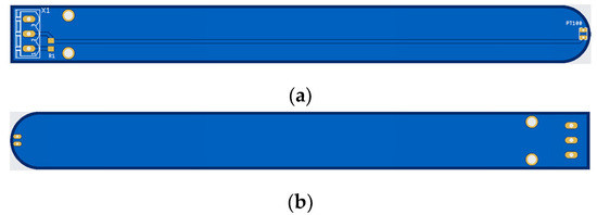 A schematic of the sensor card prepared in the Autodesk Eagle editor is shown in Figure 4, and the printed circuit layout is shown in Figure 5 [45]. The connection between the sensor and interface cards was provided through the X1 connector, as shown in Figure 4. Pin 1 of the X1 connector was the voltage output of the second power supply. The second pin of the connector was the sensor voltage output. The third pin was the DC ground terminal of the second power supply.