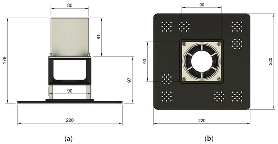 The fan heater was mounted on the measurement table using a mounting adapter with dimensions of 220 mm × 220 mm. The three-dimensional design and perspective view of the heater are shown in Figure 7.