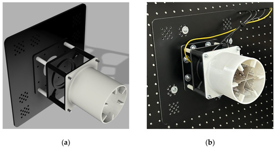 The fan heater shown in Figure 6 was designed using Autodesk Fusion 360 (Autodesk, Inc., San Francisco, CA, USA) and printed on a three-dimensional resin printer. Inside the fan heater, there was a fan motor operating between 12 and 24 V and a resistor consuming 900 W of power at a grid voltage (220 VAC).